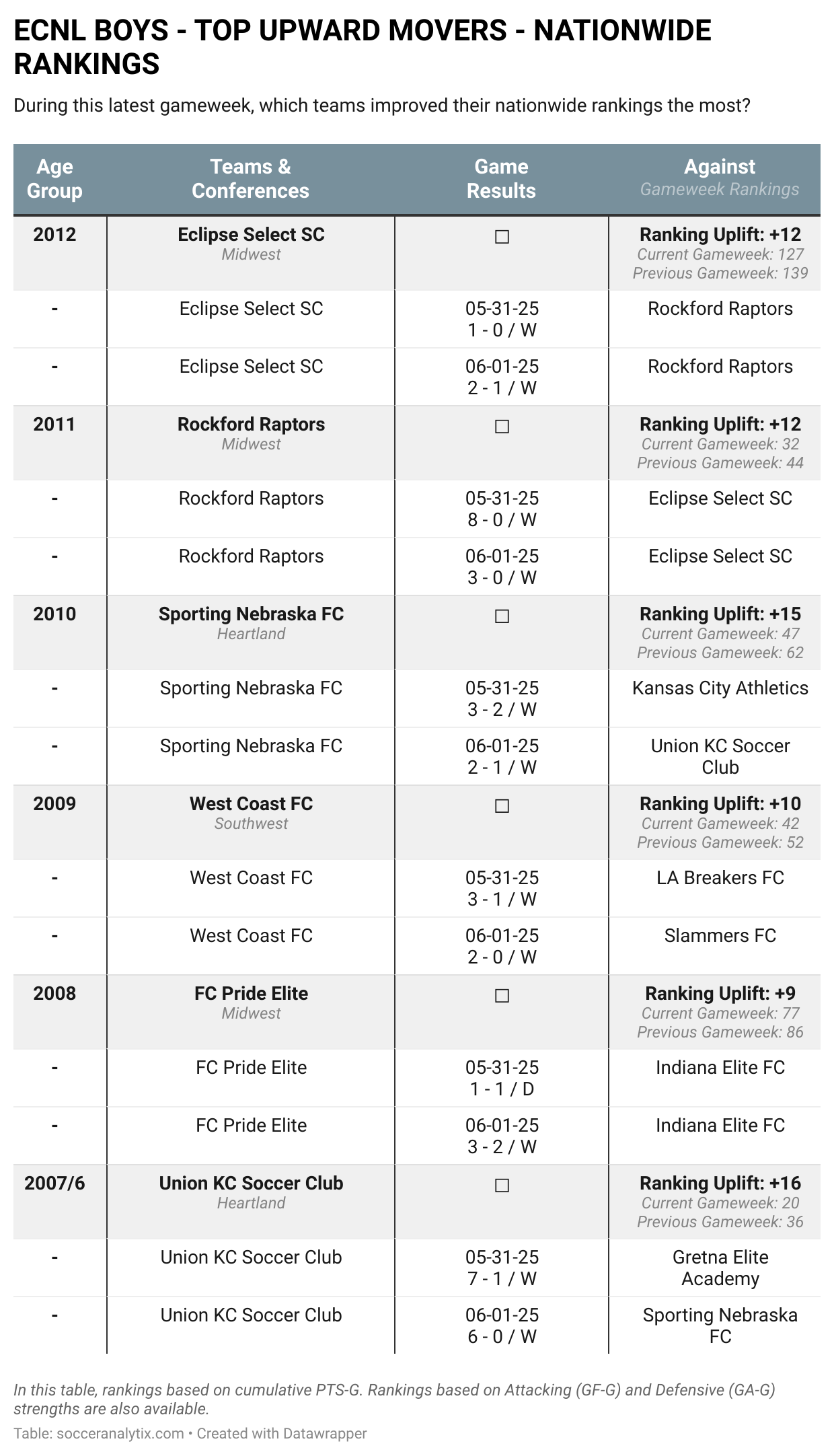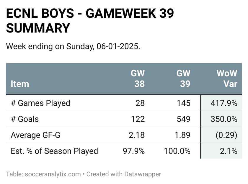 ECNL Boys Gameweek 39 ended on Sunday, June 1st, 2025. Playoffs are coming up!
