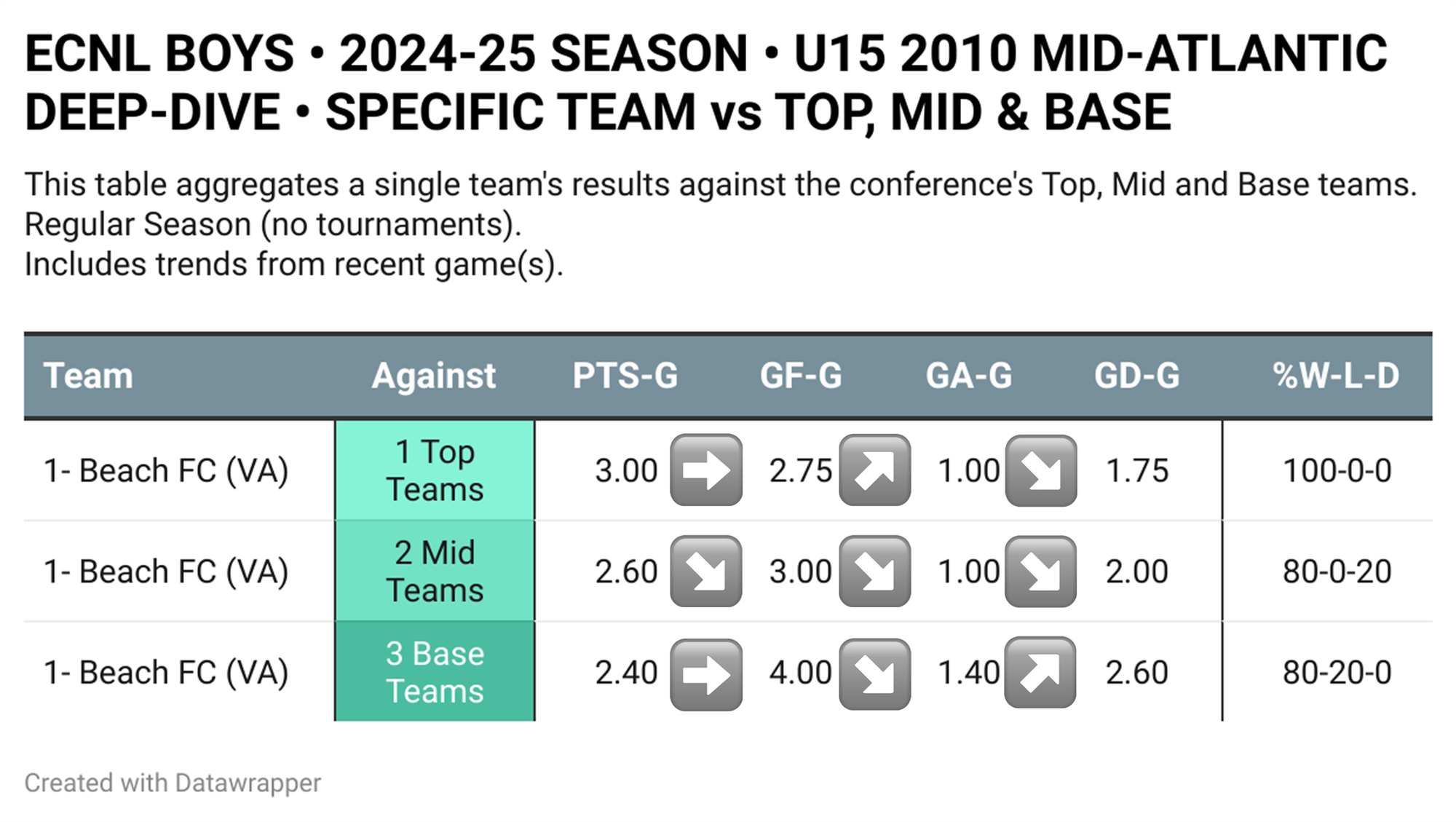 - In the Mid-Atlantic Conference, the Top Teams lost more-often (12%) against their Base Teams... than the Mid Teams (8%). In our opinion, these datapoints provide insights into a team's resilience and competitive mindset... that make a difference in a nationwide event such as the ECNL Playoffs.